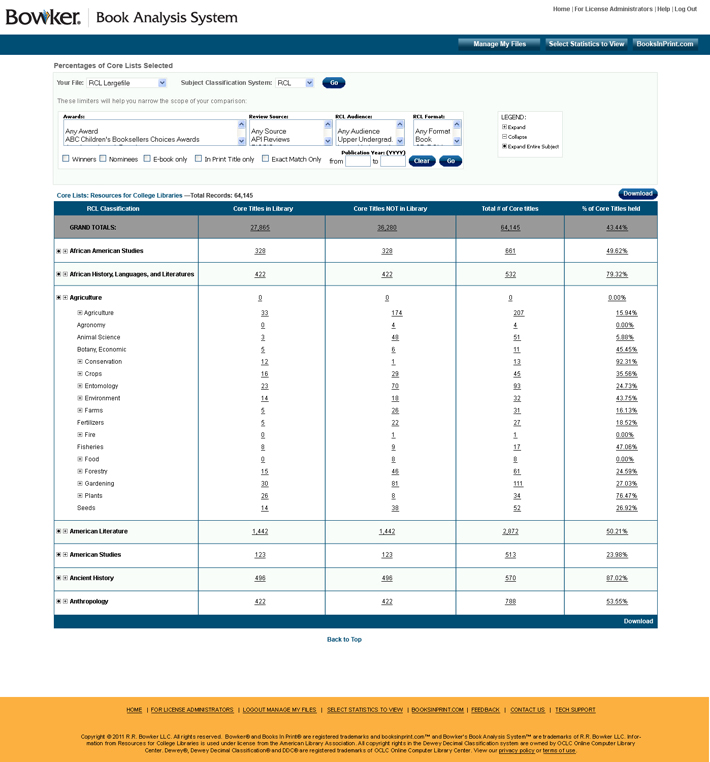 Comparison Options Bowker's Book Analysis System provides your library the opportunity to analyze your collection against Resources for College Libraries. You can upload your entire collection or choose to run an analysis subject by subject.